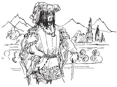 Его халат, расшитый самоцветами, падал тяжёлыми складками до самой земли. На голове у него был пышный тюрбан.