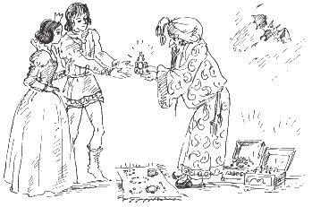 «Я никогда не встречала его, — замирая, подумала Белоснежка. — И всё же, всё же он мне кого-то напоминает. Ах да, это тот самый заморский купец! Это он унёс в зеркальце моё отражение. Он, он… Вон чёрное кольцо с магическими знаками, я узнаю его…»