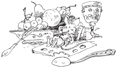 Мышонок бегал по парчовой скатерти между блюдами с заморскими яствами и выбирал себе самые отборные кусочки. Наконец он так наелся, что стал поперёк себя толще.