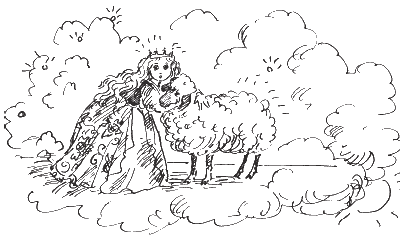 Белоснежка, низко опустив голову, пошла по облачной дорожке сада. Она срывала нежные розы и бледные лилии, но они тут же превращались в капли воды и проливались вниз сквозь Грозовую Тучу.