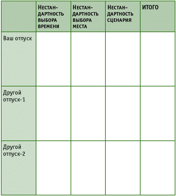 Внесите в таблицу какой-либо ваш недавний отпуск и еще два отпуска ваших друзей, родственников, коллег. Оцените сценарии отпусков по пятибалльной шкале.