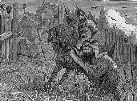 детъ — детъ онъ дубровою темною, дремучею, назжаетъ въ лсу, на полян на хоромы Соловья-разбойника. А и дворъ у Соловья былъ на шесть верстъ, а около двора желзный тынъ, а на каждой тынинк по маковк, а на маковк по головушк, тхъ самыхъ богатырей, что пытались прохать въ Кіевъ дорогою прямозжею.