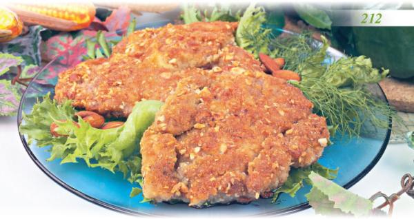 Мясо обваляйте в муке, затем обмакните в яйцо, а потом обваляйте в смеси из панировочных сухарей с орехами.