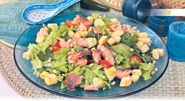Полейте салат полученной заправкой, сверху украсьте сухариками и кедровыми орешками.