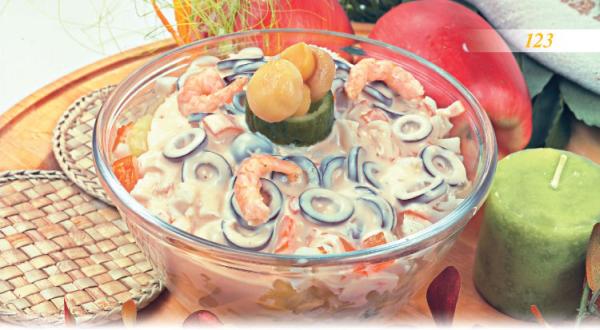 Выложите салат слоями: 1 слой – рис с яйцами, 2 слой – грибы, 3 слой – ананасы, 4 слой – крабовые палочки.