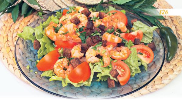 На листья салата выложите дольки помидоров, креветки, сухарики.