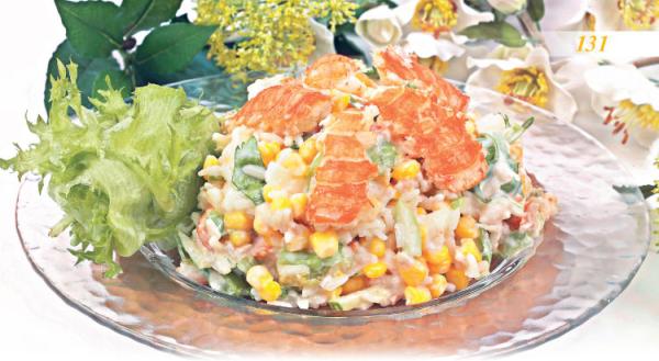 Перемешайте листья салата, кукурузу, яблоко, рис и раковые шейки.