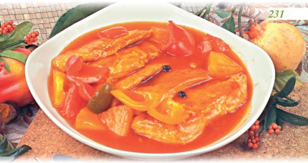 Перец и кусочки ананаса обжарьте на растительном масле, добавьте томатную пасту и сок ананаса.