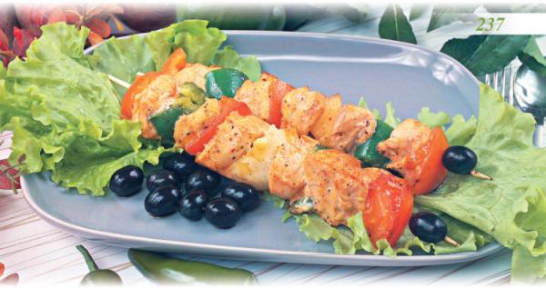 На деревянные шпажки плотно нанижите по очереди кусочки: перца, помидора, курицы и лука.