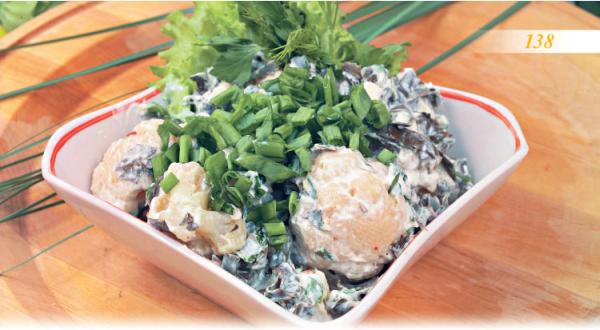 Все перемешайте, заправьте сметаной и посыпьте зеленым луком.
