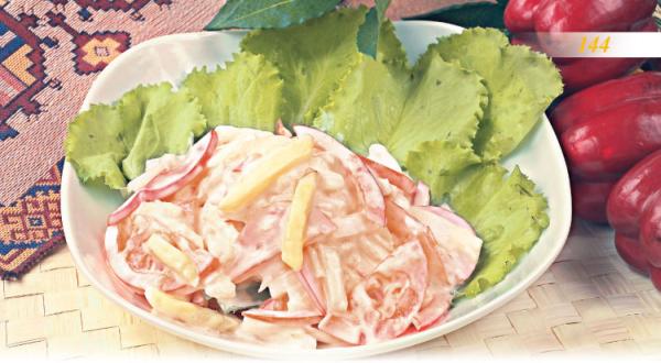 Все перемешайте, заправьте смесью сметаны и майонеза, посолите и поперчите по вкусу.