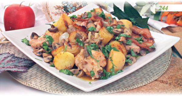 Обжарьте грибы и бекон (отдельно) и добавьте к курице.