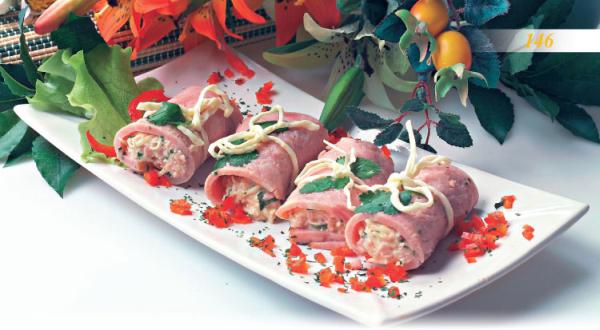 Заверните полученную массу в ломтики ветчины, перевяжите сыром «Чечил» (он сделан в виде веревочек) и украсьте зеленью.