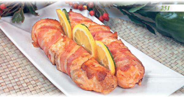 Каждый кусочек рыбы оберните беконом и обжарьте на растительном масле до готовности.