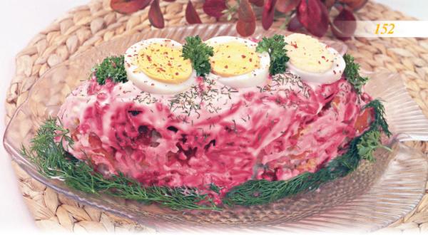 На селедку выложите слоями: картофель, затем мелко нарезанный лук, затем морковь, яблоко, натертое яйцо и свеклу.