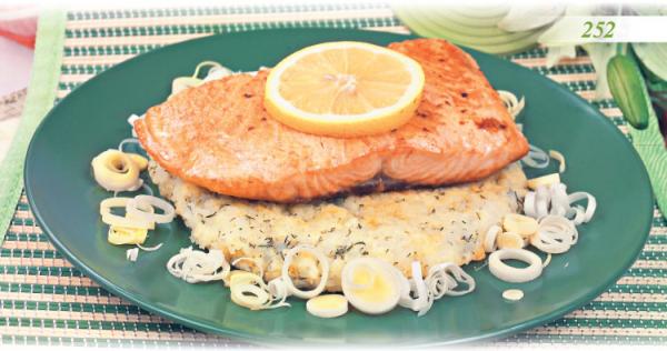 Выложите рисовую запеканку на тарелку, сверху положите обжаренную семгу, полейте растопленным сливочным маслом, посыпьте зеленью и кольцами лука-порея.