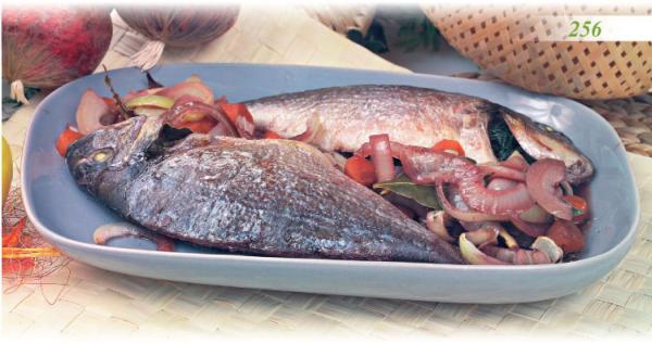Положите рыбу на небольшой смазанный маслом противень, обложите кусочками лука и моркови и лавровым листом. Добавьте перец горошком и залейте красным вином.