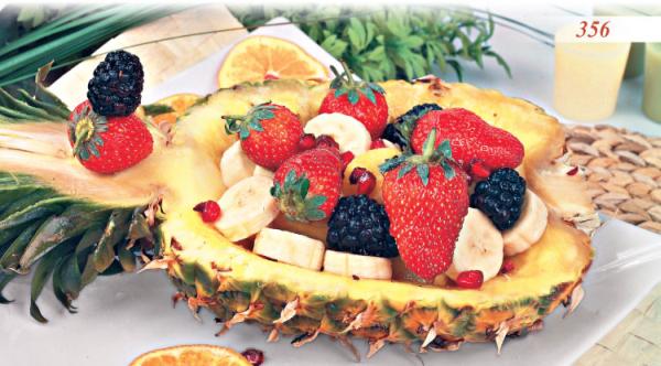 Уложите фрукты и кусочки ананаса в половинки ананаса и залейте шампанским.