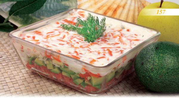 Сверху положите авокадо, натертые на терке яйца, и морковь.