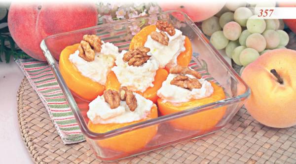 На половинку персика положите творог, а сверху ядрышко грецкого ореха.
