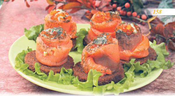 На каждый ломтик семги положите смесь масла с икрой и сверните ломтик рулетиком.