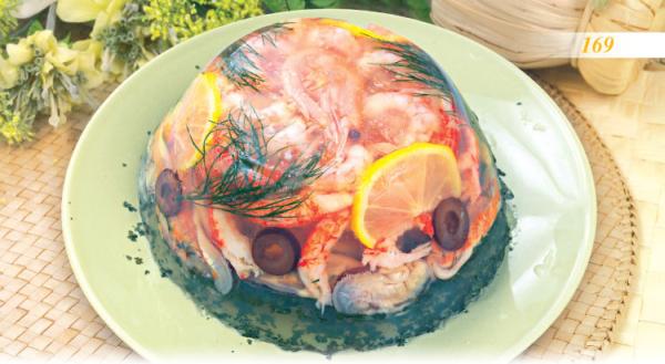 На дно глубокой полукруглой формы налейте немного бульона и дайте ему застыть в холодильнике. На застывший бульон выложите креветки, мидии, зелень, ломтики лимона, вновь залейте бульоном и поставьте в холодильник. Когда и этот слой застынет, выложите на него раковые шейки и зелень, вновь залейте бульоном и поставьте в холодильник.
