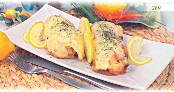 На каждое филе выложите полученную смесь, сверните рулетом, заколите шпажками и обваляйте в муке.