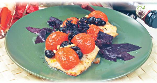 Положите на рыбу половинки маслин и помидоры черри, добавьте кедровые орехи.