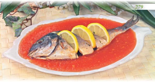 Вылейте соус на порционную тарелку, сверху уложите рыбу, вставьте в надрезы дольки лимона и подавайте к столу.