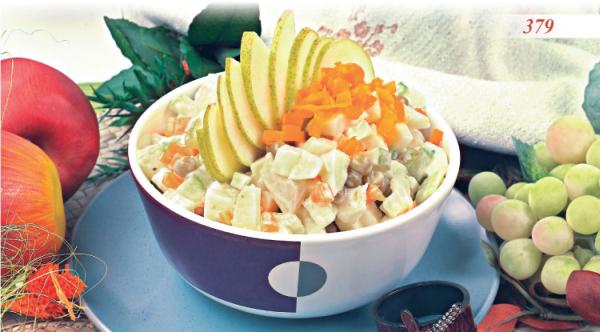 Овощи и фрукты нарежьте кубиками, перемешайте и добавьте зеленый горошек.