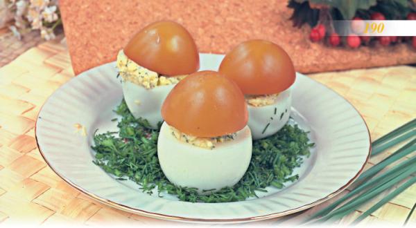 Выложите яйца на тарелку, посыпанную рубленой зеленью, и «наденьте» на них «шляпки».