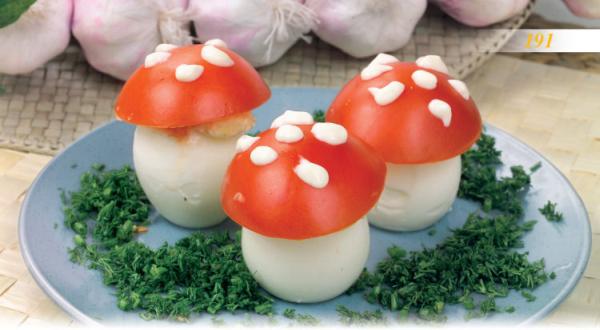 Срежьте у яиц оба конца. Поставьте яйцо на тарелку, а сверху наденьте на него шляпку из помидора, фаршированного сыром.