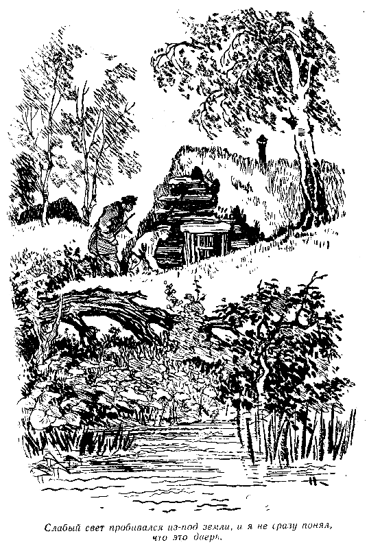 Через десять минут мы вышли на небольшую полянку. Слабый свет пробивался из-под земли, и я не сразу понял, что это дверь. Рядом с нами шло несколько человек, и Петр Сергеевич время от времени, отрываясь от разговора, то одного, то другого посылал с поручениями.