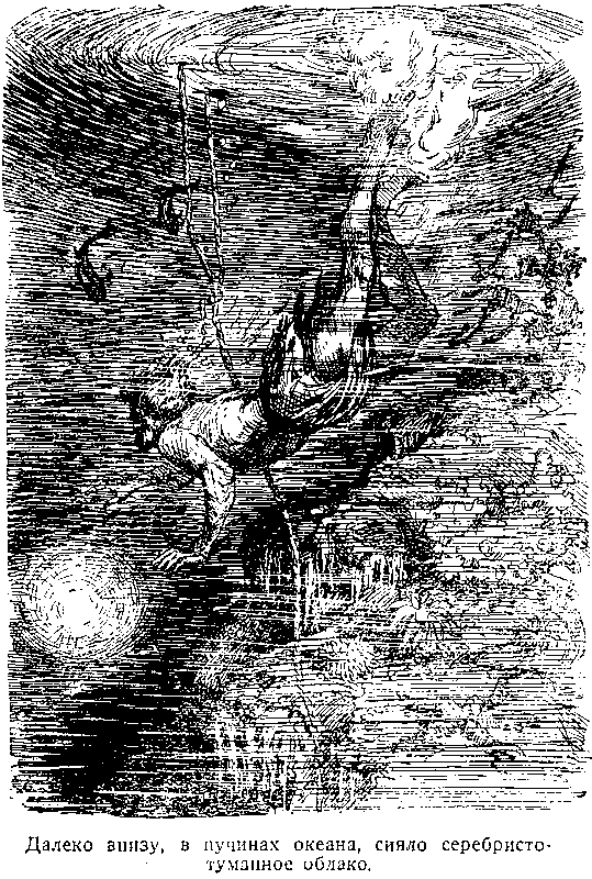 Далеко внизу, в пучинах океана, сияло огромное серебристо-туманное облако, как будто луна, уйдя с неба, погрузилась в темные воды и распространяет там свой сильный свет, и вокруг нее пляшут яркие белые точки, словно подводные духи встречают свою властительницу священными веселыми танцами. Внезапно глухой певучий удар донесся оттуда, из глубины, и потряс все оцепеневшее тело Нгаары. Удар за ударом, удар за ударом, мерные и могучие, они лились, казалось, отовсюду, словно великаны били по чудовищной, как гора, тыкве-барабану рапануйцев. Зеленые и оранжевые круги поплыли перед глазами Нгаары, начавшего уже задыхаться, и, трепеща от священного ужаса, он рванулся кверху, стараясь ничего не видеть и не слышать. Но потрясающие удары преследовали, настигали его, и наконец, почти обезумевший, Нгаара выскочил у самого борта каноэ. Он вцепился в него дрожащими, ослабевшими пальцами и долго, икая от страха, не мог отдышаться… Придя немного в себя, Нгаара с опаской оглянулся, и убедившись, что он один, приложил ухо к воде. Черная пучина оглушила его новым ударом, он подпрыгнул, как пружина, перевалился через борт каноэ и упал на дно. И опять ему показалось, что даже дно лодки едва заметно и мерно сотрясается под таинственными ударами, доносящимися снизу, и тогда, окончательно потеряв голову, Нгаара вскочил, выхватил нож, одним взмахом отрезал веревку от драгоценной сети, кормилицы семьи, и отчаянно, словно спасая жизнь, заработал веслом…