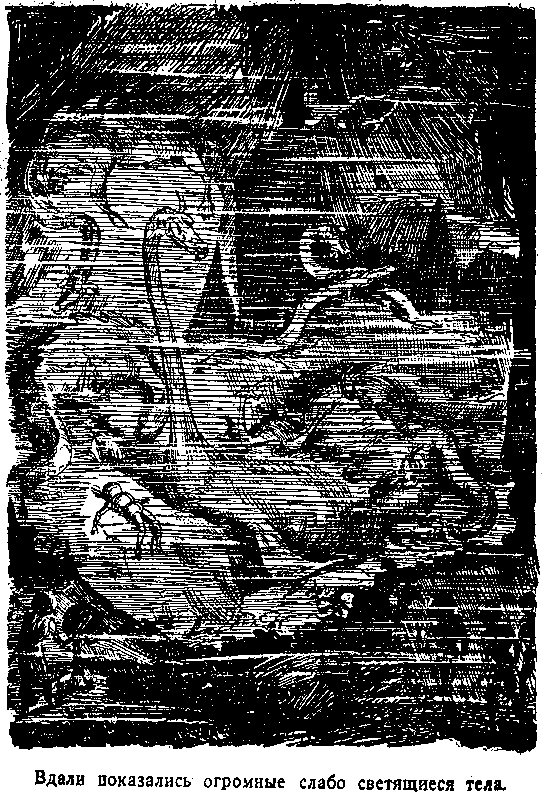 В черной тьме вдали показались огромные, слабо светящиеся голубоватые тела. Их было около двух десятков: одни — гигантских размеров, другие — поменьше. Большинство неподвижно лежало на дне, на его возвышениях и скалах, вытянувшись, словно стволы чудовищных деревьев с бочкообразным утолщением посередине. Другие носились взад и вперед на разной высоте, мерно размахивая светящимися пятнами ластов.