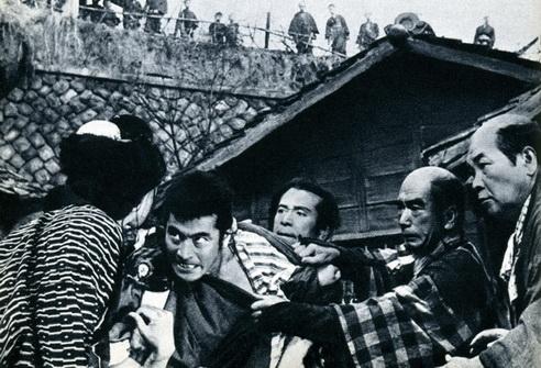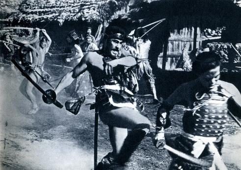 А бродячий самурай, полукрестьянин, полунищий, всячески старающийся показать свою самурайскую храбрость и ловкость, - подлинная комедия, комедия народная, соленая, грубоватая. В "Семи самураях" рассказывается, как бродячие нищие воины защищают крестьянскую общину от грабительских набегов разбойничьих банд (сюжет этого замечательного фильма Акира Куросава был полностью заимствован и перенесен на ковбойский материал в американском фильме "Великолепная семерка", причем потерял при этом гуманизм, социальную глубину и антивоенную направленность). Тосиро Мифунэ удивительно щедр на комедийные приемы. Он падает, плачет, стремительно бегает, подергиваясь всем телом, как марионетка, хромает, строит уморительные гримасы, хлопает себя по ляжкам, кувыркается, орет. Но среди этих балаганных трюков вдруг промелькнет такая искренняя, добрая, белозубая улыбка, такая простая и милая интонация, что образ сразу становится правдивым, обаятельным, человечным. Несдержанность, неразборчивость в средствах оправдывается искренностью чувства, правдой переживаний актера.