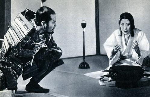 В Макбете Мифунэ величествен, его движения торжественны и гармоничны. Здесь он действительно похож на льва. На неподвижном лице с огромными, горящими глазами каким-то чудом отражаются сложные чувства, рождаемые словами коварной и властолюбивой жены. Это подлинная, высокая трагедия.