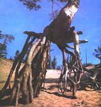 Ну вот, выросла сосенка, стал с ней играть ветер. Как налетит с Байкала, как схватит её за ветви — вот-вот вытащит и унесёт. А деревце крепче корнями за землю держится. Тогда ветер пускается на хитрость. Оставит в покое игольчатые лапы сосенки, станет песок под ней разбрасывать. А она ещё сильнее за землю держится. Растут её корни, вытягиваются, как ноги оленя, ветер выметает из-под них песок. Сотни лет длится эта игра не на жизнь, а на смерть. Но тот, кто крепко держится за родную землю, всегда выживает. Так и появились сосны, похожие на оленей с зелёными рогами. И растут они в единственном месте на свете — на Байкале.