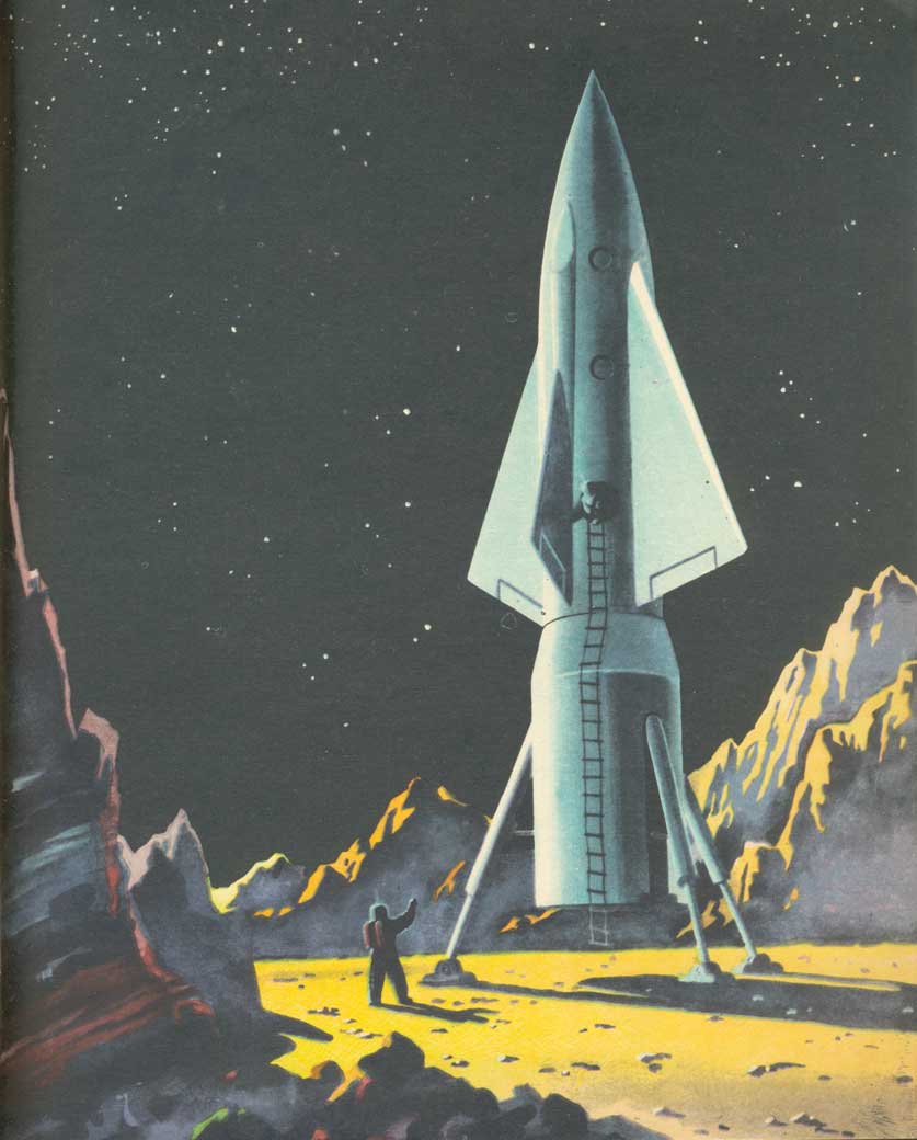 Выходим из корабля в скафандре. На Луне воздуха нет. Скафандр годится тот же самый, в котором мы выходили в космосе. Ведь здесь почти то же самое. Так же нестерпимо жарит ослепительное солнце. Так же «пышет холодом» от черного неба и от глубоких темных теней на скалах.