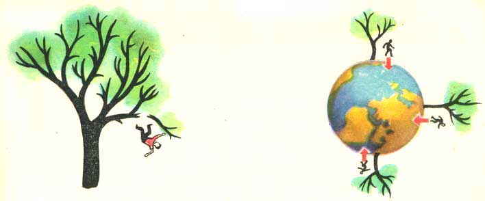 Земля притягивает к себе одинаково со всех сторон. И если с деревьев упадут все три мальчика, то все они полетят к Земле: на нашем рисунке один — вниз, другой — влево, третий — вверх.