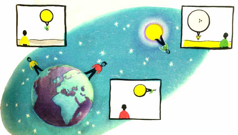 Если мы представим себе трех мальчиков, стоящих на Земле и Луне, то каждый из них будет видеть других в самых невероятных положениях.