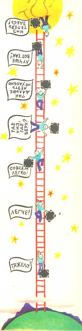 Продолжая лезть по лестнице все в ту же сторону, мы будем теперь уже не «подниматься на Луну», а «опускаться на Луну». И, конечно, на вопрос, где низ, мы теперь, не колеблясь, ответили бы: низ — это Луна, она у нас под ногами!