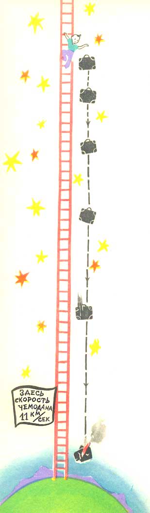 Чем выше мы станем забираться, тем легче будет становиться чемодан. Но теперь уже не только потому, что его все слабее притягивает Земля, но и потому, что его все сильнее начинает тянуть вверх Луна. Она будет все больше помогать нам держать в руках чемодан.