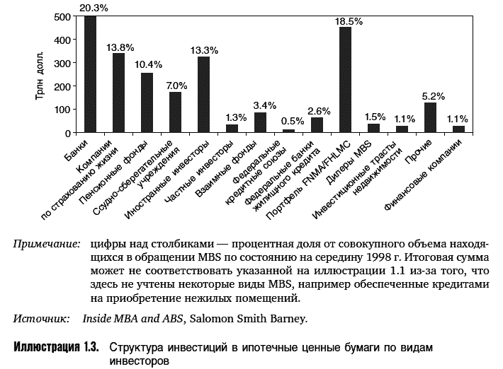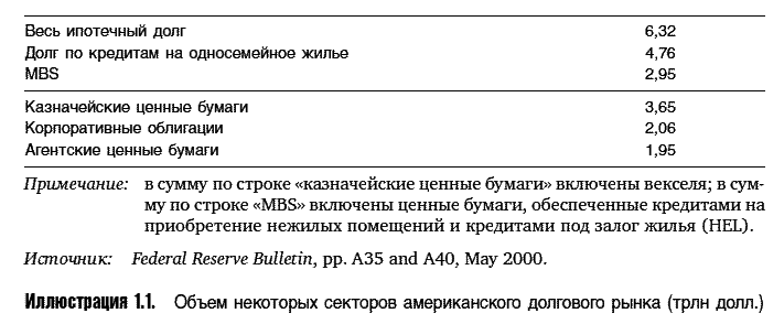 В последнее двадцатилетие рынок MBS демонстрирует феноменальный рост. Совокупный объем находящихся в обращении MBS увеличился примерно со 100 млрд в 1980 г. до 3 трлн долл., и, как видно из иллюстрации 1.1, рынок ипотечных ценных бумаг стал важным сектором американского рынка облигаций.