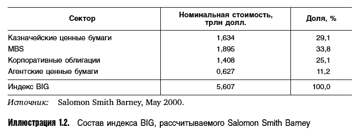 Иллюстрация 1.2 показывает состав рассчитываемого Salomon Smith Barney сводного индекса американских бумаг инвестиционного уровня – индекса BIG (Broad Investment Grade). Обратите внимание, что доля MBS в этом индексе больше, чем следует из иллюстрации 1.1, поскольку почти половина казначейских ценных бумаг – это векселя со сроком погашения менее одного года, не учитываемые при расчете [5] .