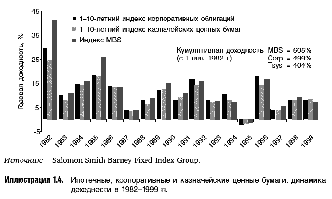 Иллюстрация 1.4 также показывает кумулятивную доходность индексов Salomon Smith Barney для ценных бумаг с фиксированным доходом. MBS существенно опережают казначейские ценные бумаги и корпоративные облигации. Такое положение сохранялось даже в 1990-х гг., которые были идеальными для казначейских ценных бумаг и корпоративных облигаций (падающие процентные ставки и длительное оживление после рецессии начала 1990-х) и не слишком благоприятными для MBS (несколько волн рефинансирования).
