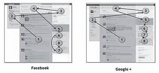 В одном из проектов EyeTrackShop отслеживала, как пользователи изучают домашние страницы Facebook и Google+. Результаты, представленные на рис. 41.1, показали, что в обоих случаях глаза пользователей сразу устремлялись на большую колонку статуса в средине экрана, затем на список категорий слева, а потом перепрыгивали на сообщения справа.