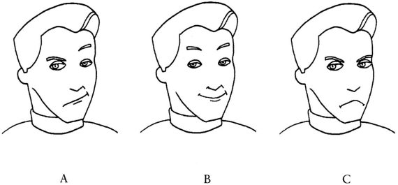 Такая улыбка выражает смешанные эмоции. На рисунке А под влиянием правого полушария мозга левая бровь, щека и уголок рта приподняты. То есть левая сторона лица улыбается. В то же время левое полушарие мозга заставляет правую сторону лица сердито нахмуриться. Если посередине рисунка А поставить зеркало, вы увидите лица, выражающие совершенно разные эмоции. Отражение правой стороны лица, показанное на рисунке В, искренне улыбается. Отражение же левой демонстрирует нам сердито нахмуренное лицо.