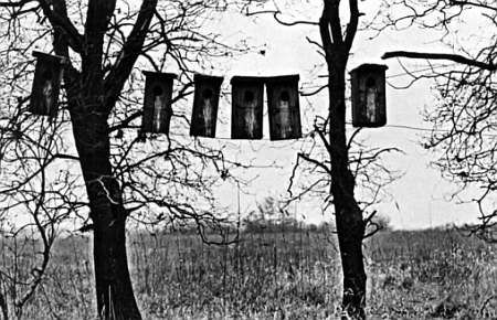 Любопытства ради посмотрите на эту гирлянду скворечен, висящих на проволоке. Снимок сделан недавно в Черноморском заповеднике. Тут за птенцами скворцов охотится полоз. Змея искусно лазает по деревьям. Забравшись в скворечник, полоз опустошает его и, свернувшись, дремлет тут же, в скворечнике, до новой охоты. По проволоке не очень просто забраться в скворечник, но мне рассказали: полоз после многих попыток все-таки ухитряется…