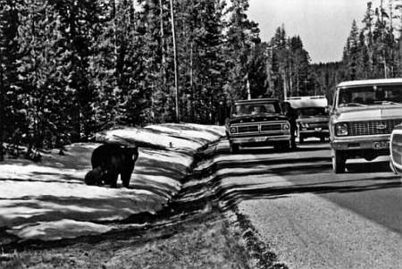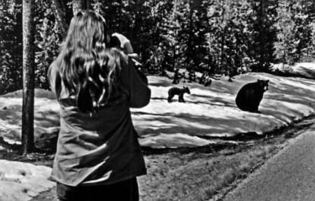 Об этих снимках. Они сделаны в Йеллоустонском парке. Медведица с медвежонком вышли попрошайничать на дорогу.